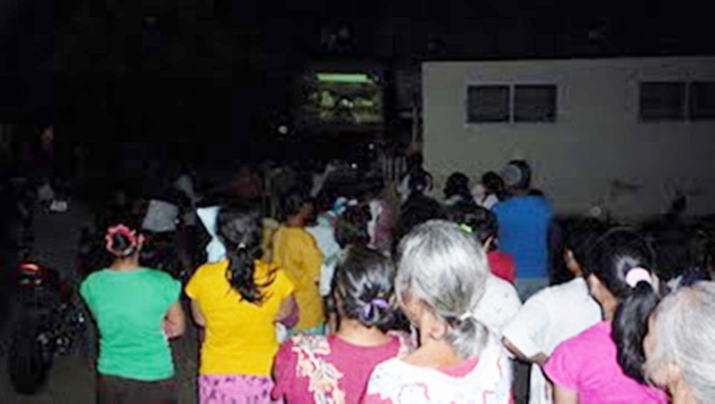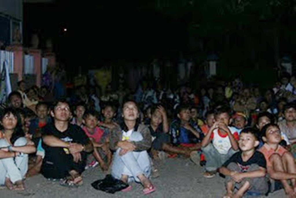 Anak-anak yang duduk berjajar di baris depan tertawa terpingkal melihat wajahnya atau wajah teman-temannya terpampang di layar lebar. Padahal bukan adegan lucu yang disaksikan. Hanya karena ditonton secara bersama oleh teman, tetangga, dan orang-orang sekampung.