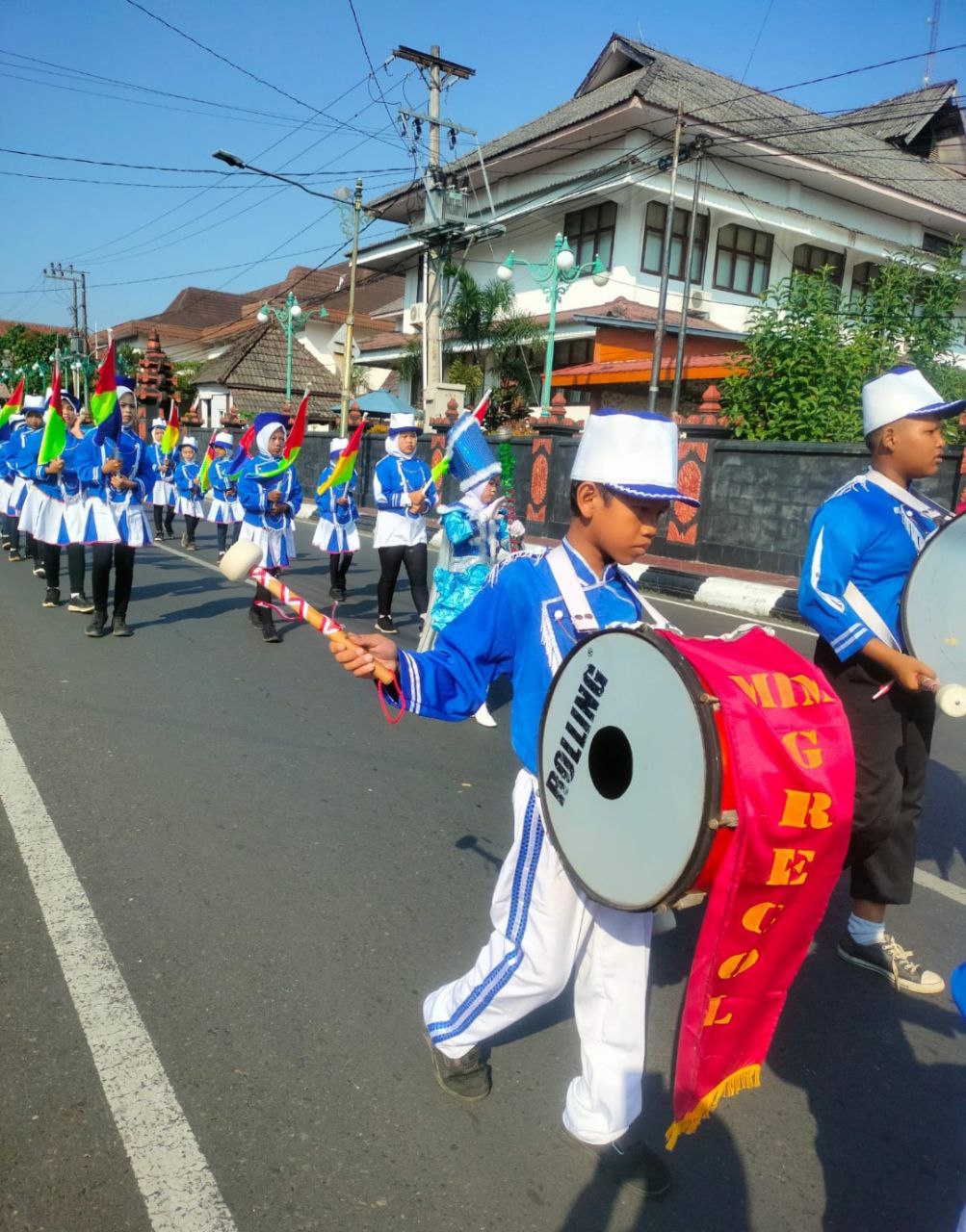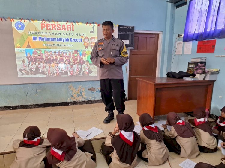 Bhabinkamtibmas Polsek Kalimanah, Polres Purbalingga, Aipda Wahyu Sekti Santosa memberikan penyuluhan kepada 40 siswa, peserta Perkemahan Satu Hari yang diselenggarakan oleh Madrasah Ibtidaiyah Muhammadiyah (MIM) Grecol, Selasa (15/10).
